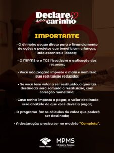 O Ministério Público de Mato Grosso do Sul (MPMS) está promovendo a campanha “Declare o Seu Carinho 2026”, com o objetivo de incentivar os contribuintes a destinarem parte do Imposto de Renda para fundos municipais que financiam ações sociais voltadas a crianças, adolescentes e idosos.