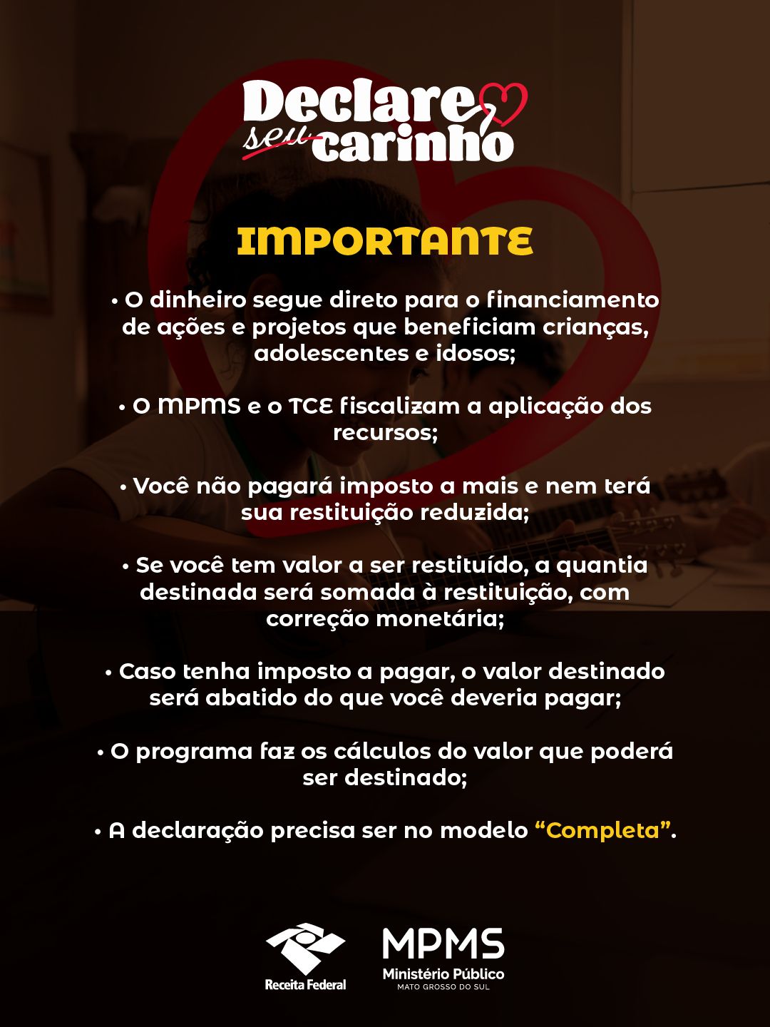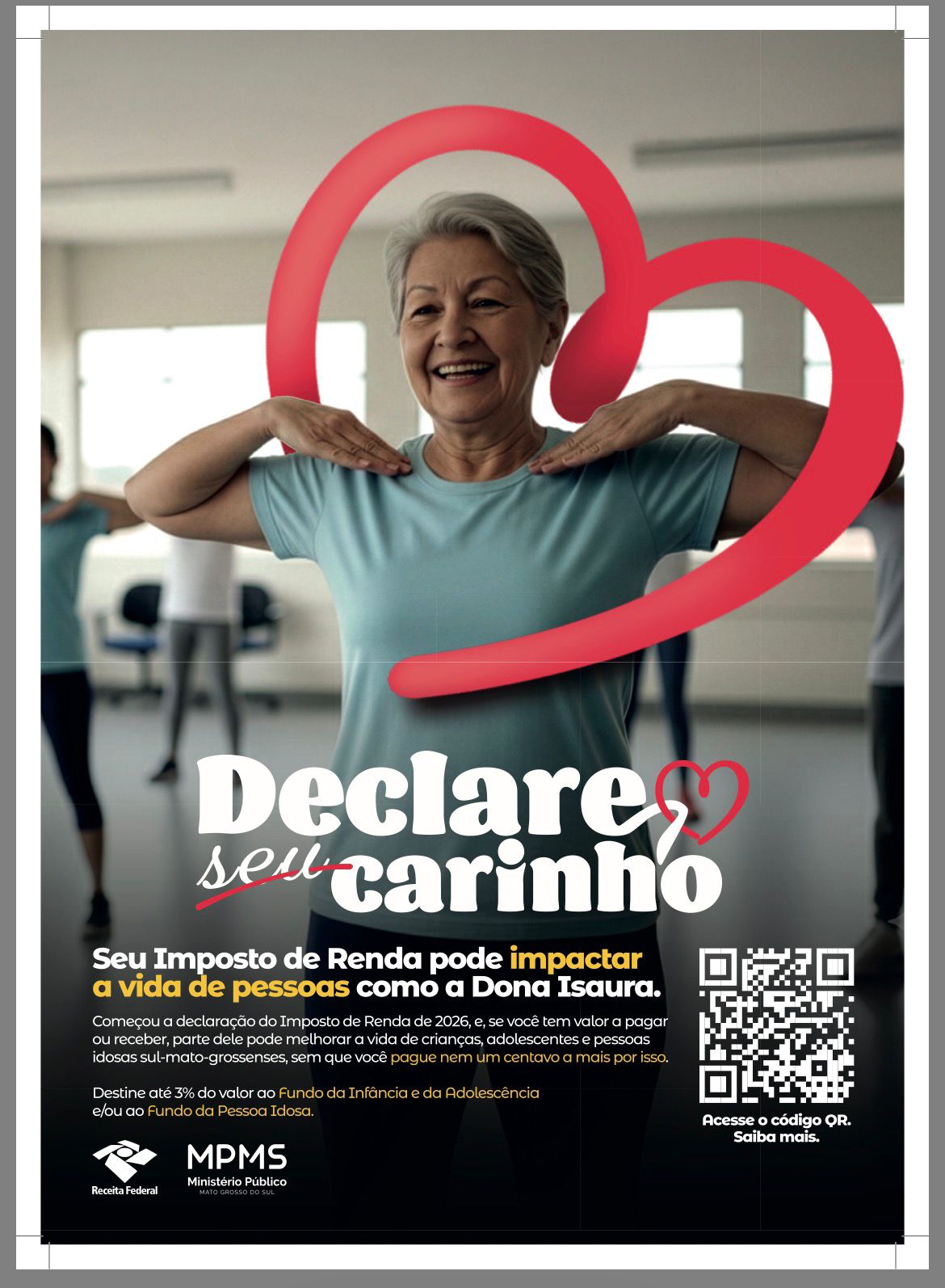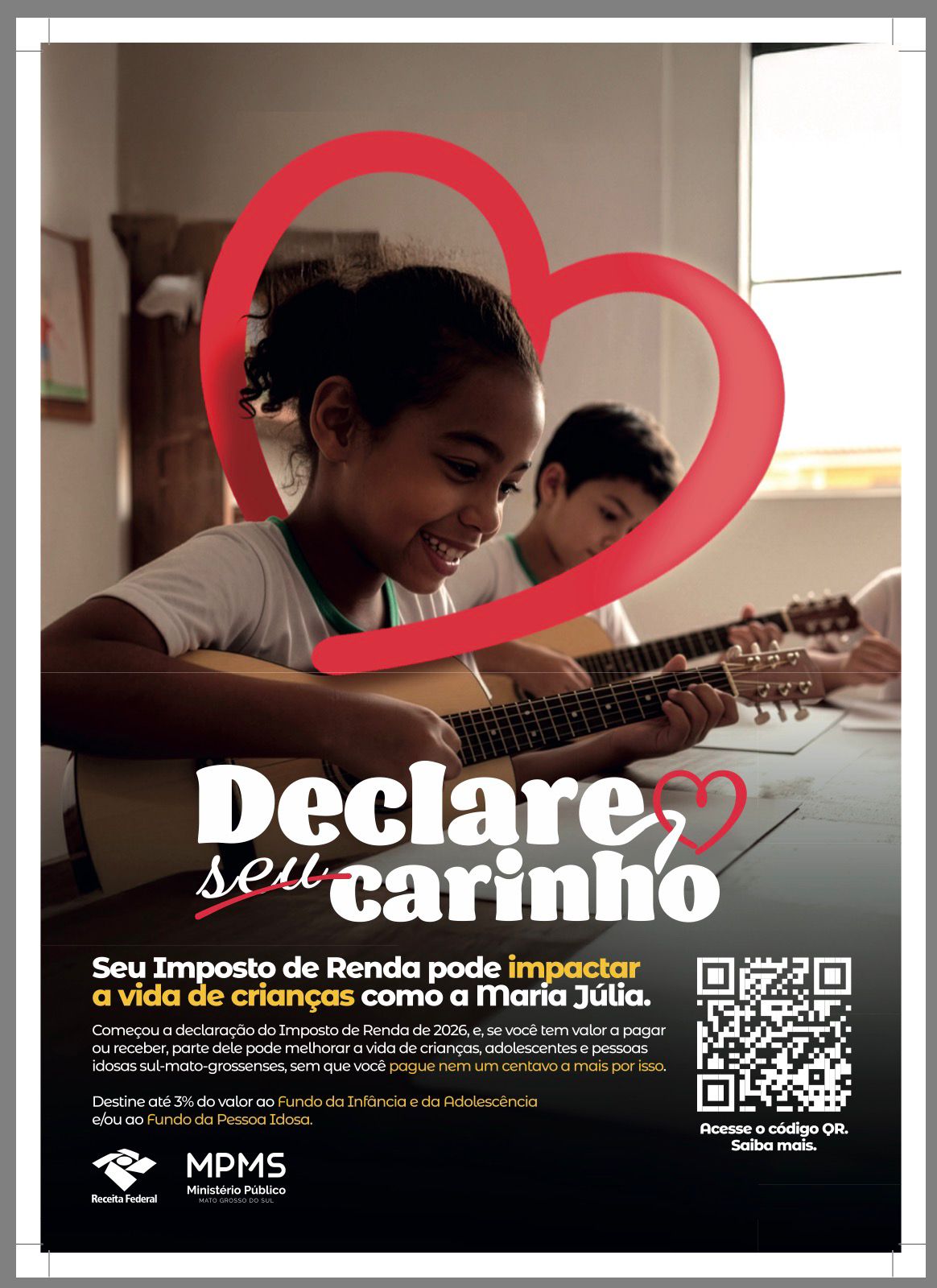 O Ministério Público de Mato Grosso do Sul (MPMS) está promovendo a campanha “Declare o Seu Carinho 2026”, com o objetivo de incentivar os contribuintes a destinarem parte do Imposto de Renda para fundos municipais que financiam ações sociais voltadas a crianças, adolescentes e idosos.