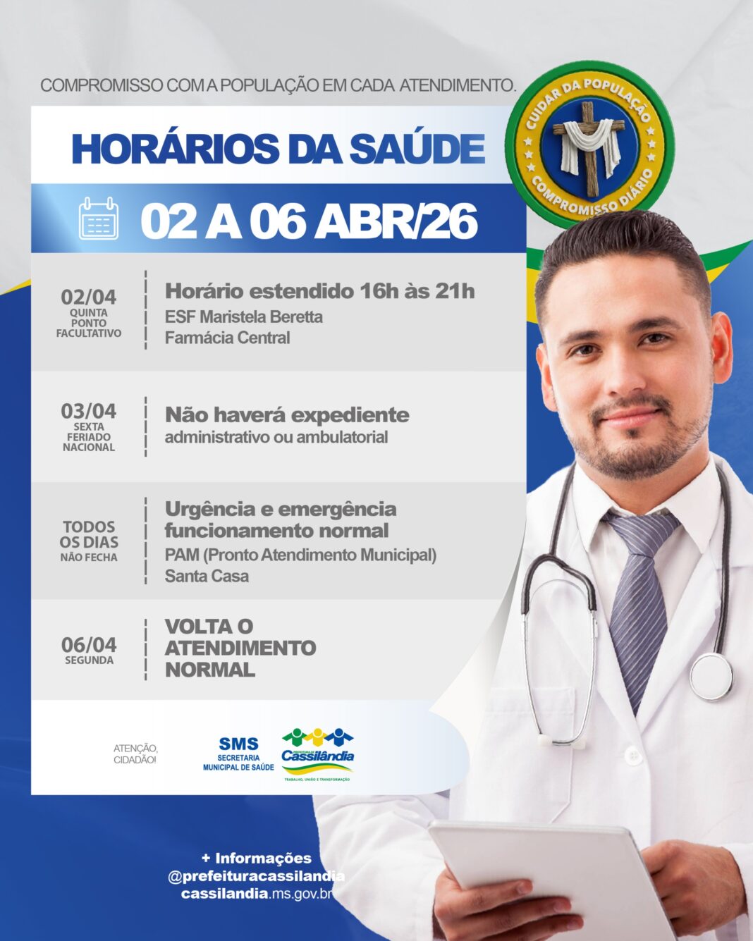 A administração municipal reforça que os serviços de urgência e emergência seguirão funcionando normalmente, sem interrupção, durante todos os dias. O atendimento será garantido pelo Pronto Atendimento Municipal (PAM) e pela Santa Casa de Misericórdia de Cassilândia, que operam 24 horas por dia.