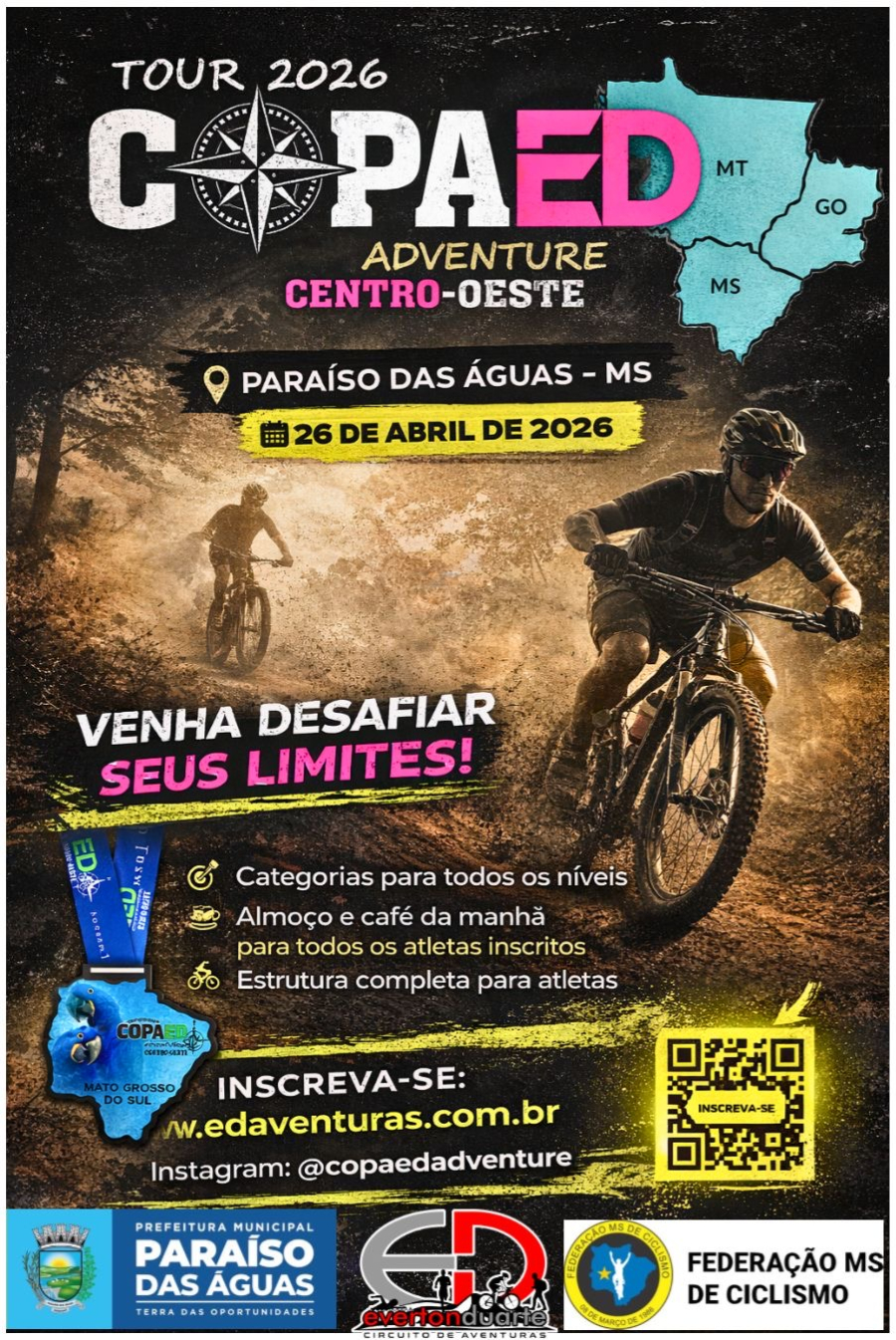 Paraíso das Águas será palco de um grande evento esportivo no próximo dia 26 de abril de 2026. O município sediará uma das etapas do Tour 2026 Copa ED Adventure Centro-Oeste, competição de mountain bike que promete movimentar atletas e amantes do ciclismo de toda a região Centro-Oeste.