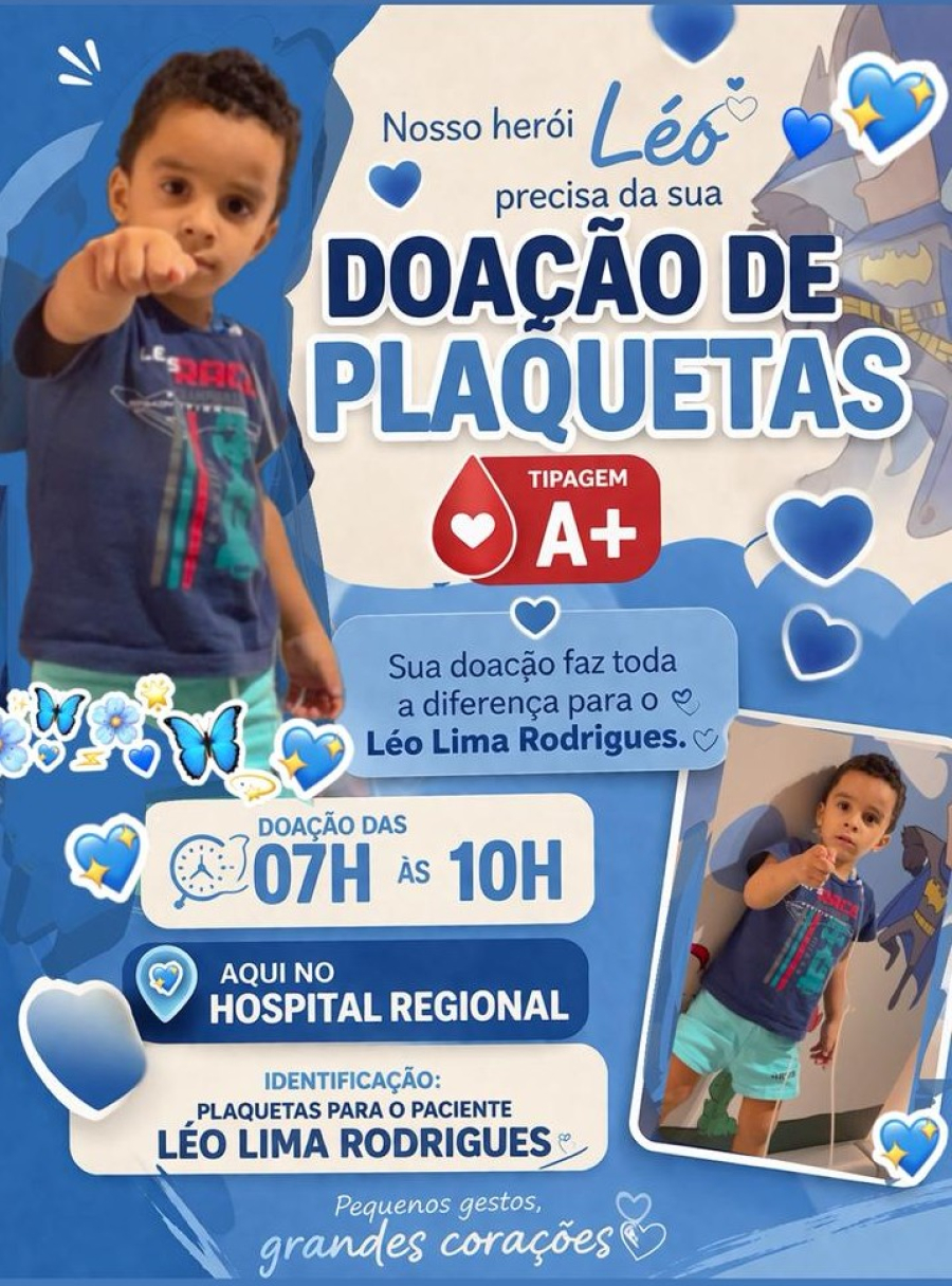Uma corrente de solidariedade tem mobilizado familiares, amigos e a comunidade em torno do pequeno Léo Lima Rodrigues, que necessita com urgência de doação de plaquetas. A campanha está sendo realizada no Hospital Regional, com atendimento das 7h às 10h, e tem como objetivo garantir o suporte necessário ao tratamento da criança.