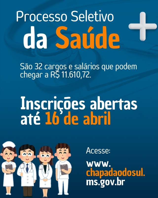 Profissionais da área da saúde têm uma nova oportunidade para trabalhar na Administração Municipal de Chapadão do Sul. A Prefeitura, por meio da Secretaria de Saúde, está com inscrições abertas para a realização de processo seletivo.
