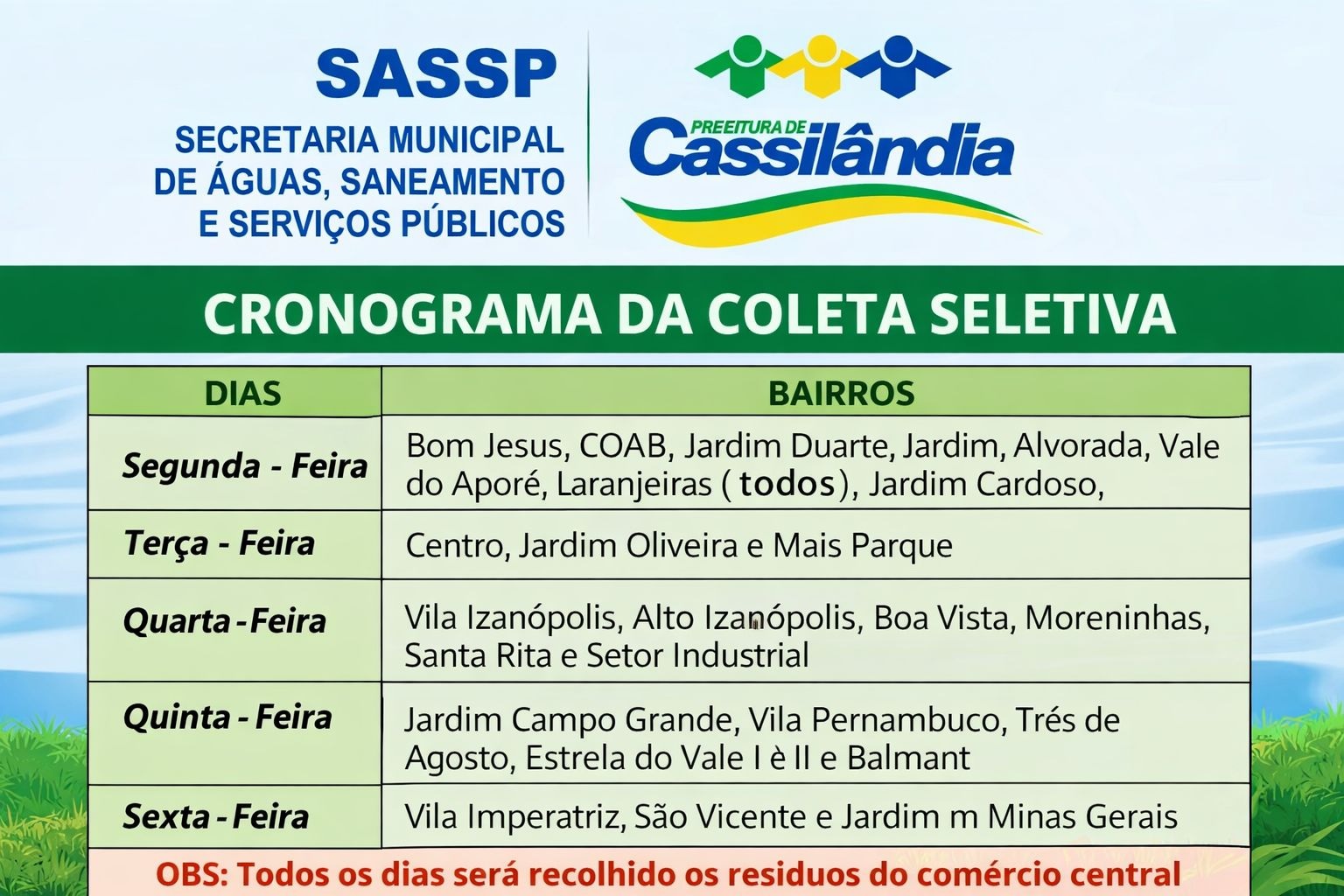 A iniciativa destaca a importância de os moradores estarem atentos aos dias específicos da coleta em seus bairros, garantindo que os materiais recicláveis sejam descartados de forma adequada e no momento correto.