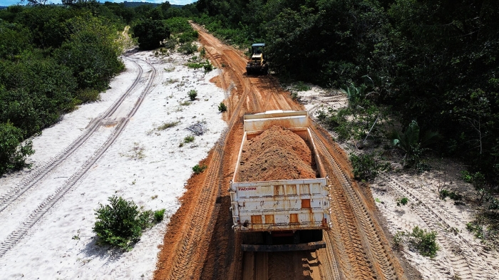 A estrada, antes marcada por trechos de areia fofa e difícil circulação, agora recebe reforço com terra e compactação, permitindo o trânsito de veículos que antes não conseguiam passar.