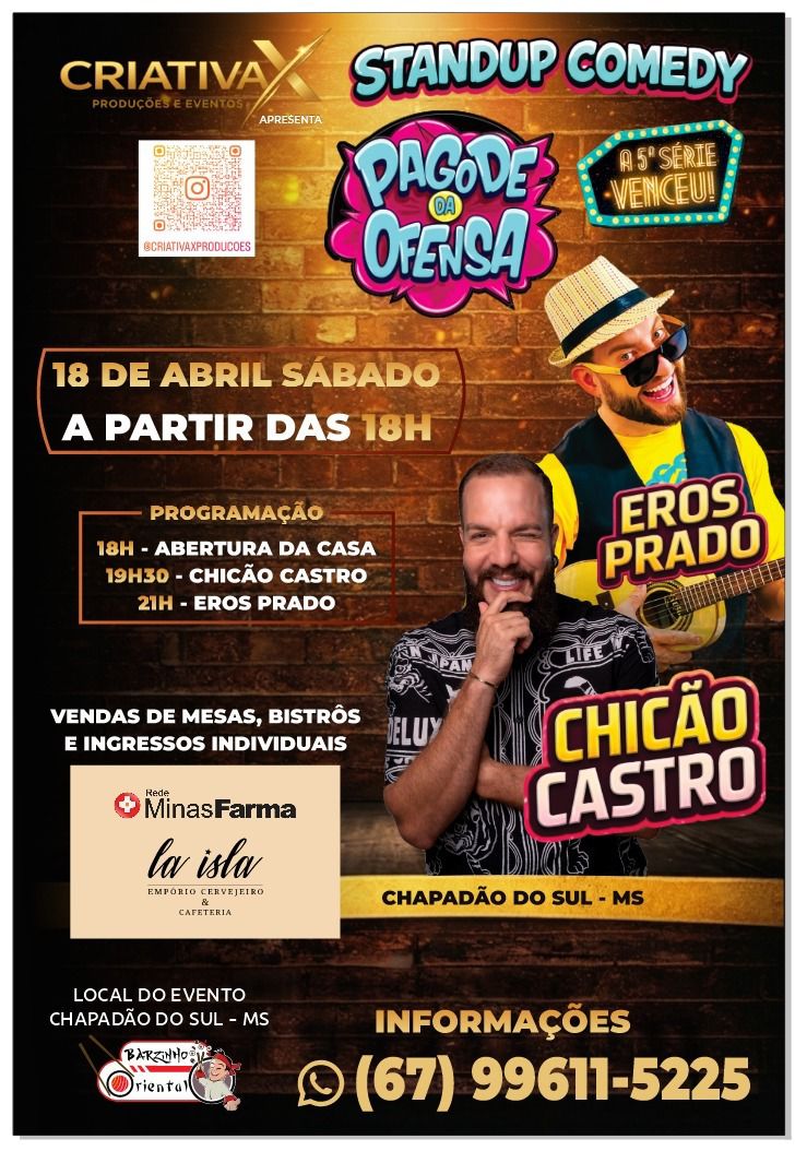 No dia 18/04 (sábado agora) acontece a realização do show do Eros Prado + Chicão Castro, aqui em Chapadão do Sul. A proposta é trazer um evento de qualidade pra cidade, com comédia e música, algo diferente do que a gente costuma ter por aqui.
