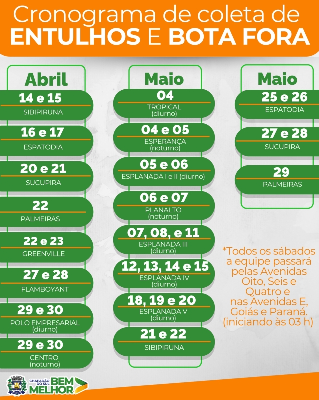 A prefeitura de Chapadão do Sul divulga o calendário da coleta de entulhos, que será realizada em vários bairros da cidade durante o final do mês de abril e maio. Com o objetivo de manter a cidade organizada, limpa e contribuir para a saúde pública, também orienta os moradores sobre o PERÍODO CORRETO para descarte dos materiais.