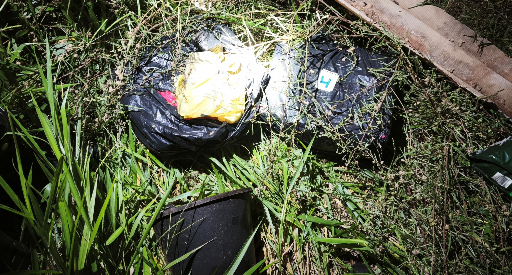 Diante da suspeita, os policiais realizaram vistoria no local. Nos fundos do terreno, em meio à vegetação, foram encontrados indícios de que objetos estariam escondidos. Durante a averiguação, a equipe localizou diversos volumes encobertos por telhas quebradas, saco de ração e um recipiente térmico.