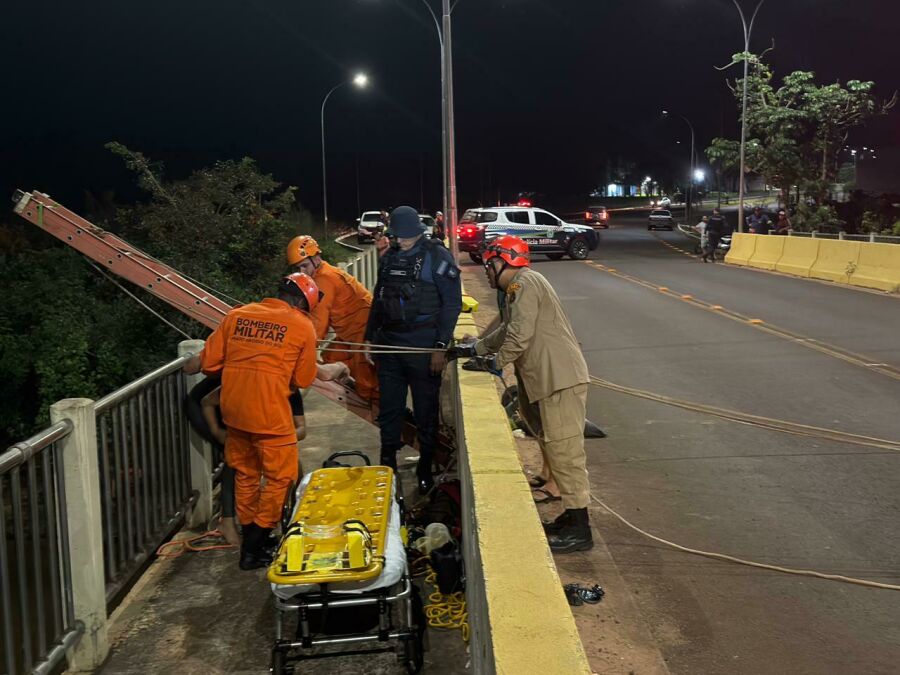 O Corpo de Bombeiros foi acionado e realizou o resgate utilizando técnicas com cordas e escada, conseguindo retirar a vítima e levá-la de volta à parte superior da ponte.
