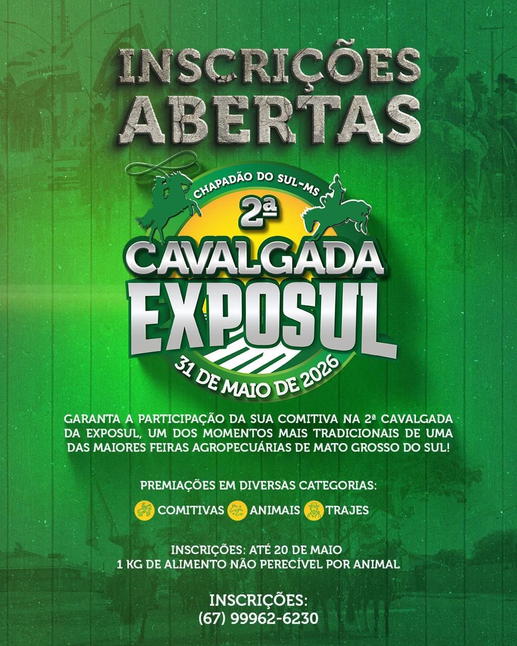 A tradição sertaneja já tem data marcada para tomar conta das ruas de Chapadão do Sul. Estão oficialmente abertas as inscrições para a 2ª Cavalgada da EXPOSUL, que será realizada no dia 31 de maio de 2026, como parte da programação da 32ª EXPOSUL.