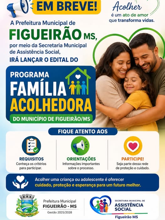 A Prefeitura Municipal de Figueirão/MS, por meio da Secretaria Municipal de Assistência Social, irá lançar o edital do Programa Família Acolhedora
