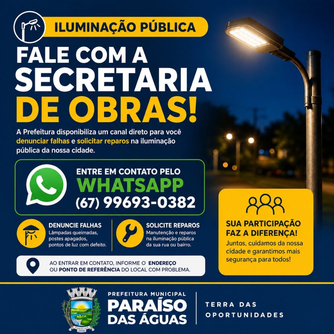 A Prefeitura Municipal de Paraíso das Águas, por meio da Secretaria de Infraestrutura Rural e Urbana, informa que está disponível um canal direto de comunicação com a população para tratar de demandas relacionadas à iluminação pública.