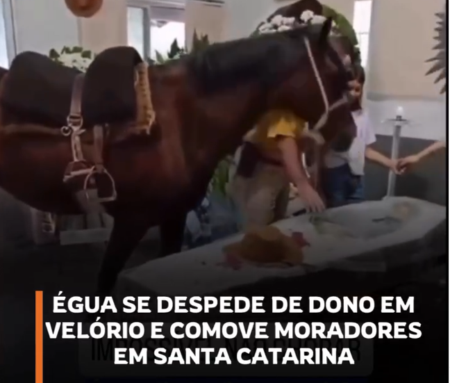 O animal foi levado até o local da cerimônia e, ao se aproximar do caixão, protagonizou um momento que tocou todos os presentes. De forma lenta, a égua caminhou até o corpo, relinchou alto e encostou a cabeça no caixão. Em seguida, permaneceu imóvel, como se reconhecesse a despedida definitiva de quem cuidou dela durante toda a vida.