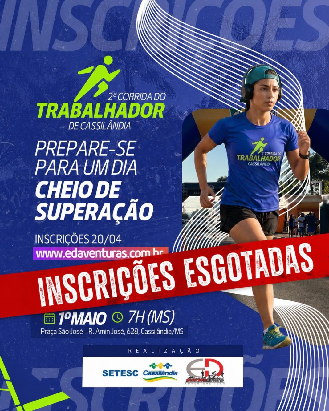 A Prefeitura Municipal de Cassilândia, em parceria com a SETESC, comemora o grande sucesso da Corrida do Trabalhador, que teve suas inscrições encerradas antecipadamente devido à alta procura. O número total de participantes foi atingido rapidamente, demonstrando o entusiasmo da população e o fortalecimento das ações voltadas ao esporte e qualidade de vida no município.