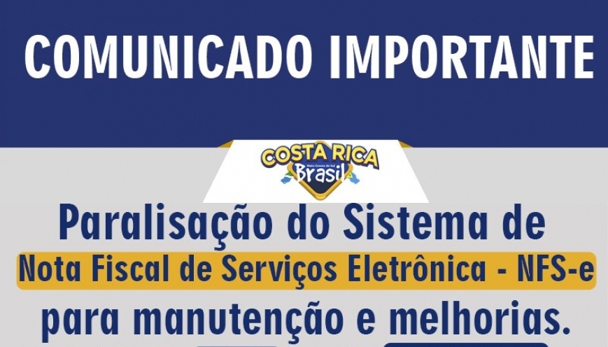Prefeitura de Costa Rica informa que o sistema para emissão de Nota Fiscal estará em manutenção neste final de semana
