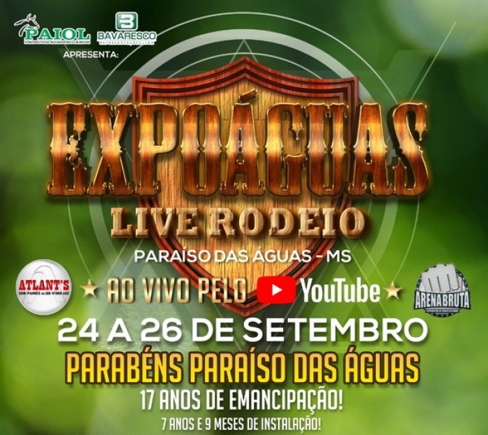 Está confirmada a data da realização da Expoáguas 2020 Live Rodeio, sem público. De 24 a 26 de setembro, a partir das 19h, desta vez para o mundo, com alcance de mais de 100 mil pessoas, pelos canais Atlants TV (clique aqui), Arena Bruta (clique aqui) e Facebook.