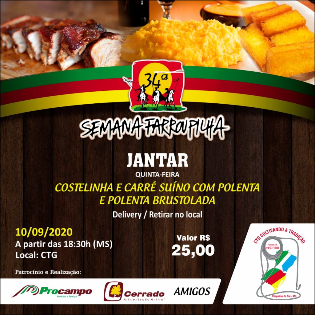 Começa hoje as comemorações da Semana Farroupilha em Chapadão do Sul. A abertura será com um jantar Delivery, com o cardápio costelinha e carne suíno com polenta e polenta brustolada – patrocínio e realização: Procampo, Cerrado e amigos.