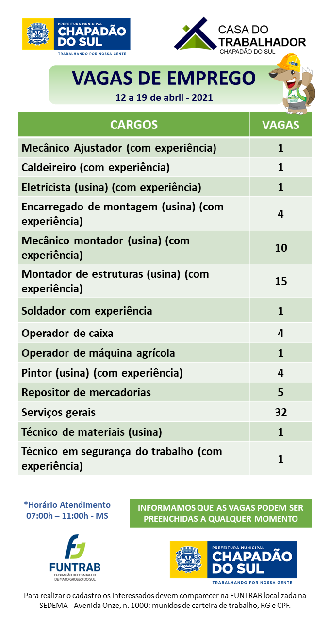 Para quem está precisando voltar ao mercado de trabalho ou busca um mudança de emprego, a Prefeitura de Chapadão do Sul e a SEDEMA, por meio da Casa do Trabalhador de Chapadão do Sul, disponibilizam mais de 80 vagas de emprego no município.
