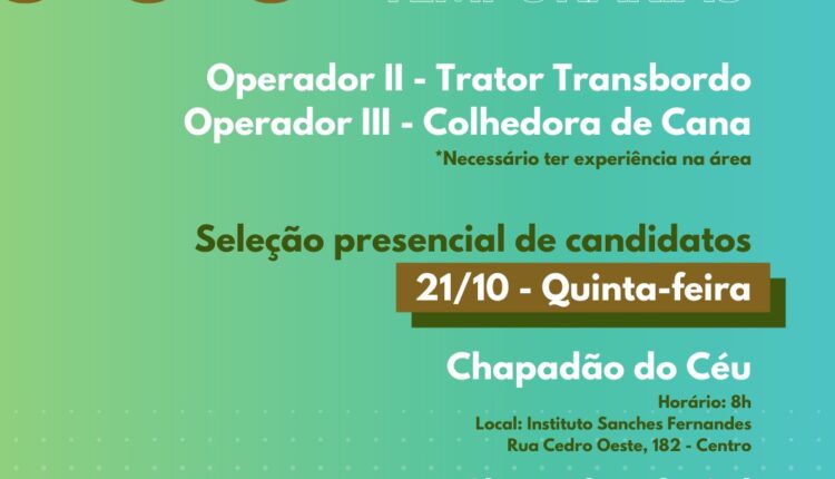 Nessa quinta-feira, 21, será realizado uma seleção presencial de candidatos em Chapadão do Céu e Chapadão do Sul.