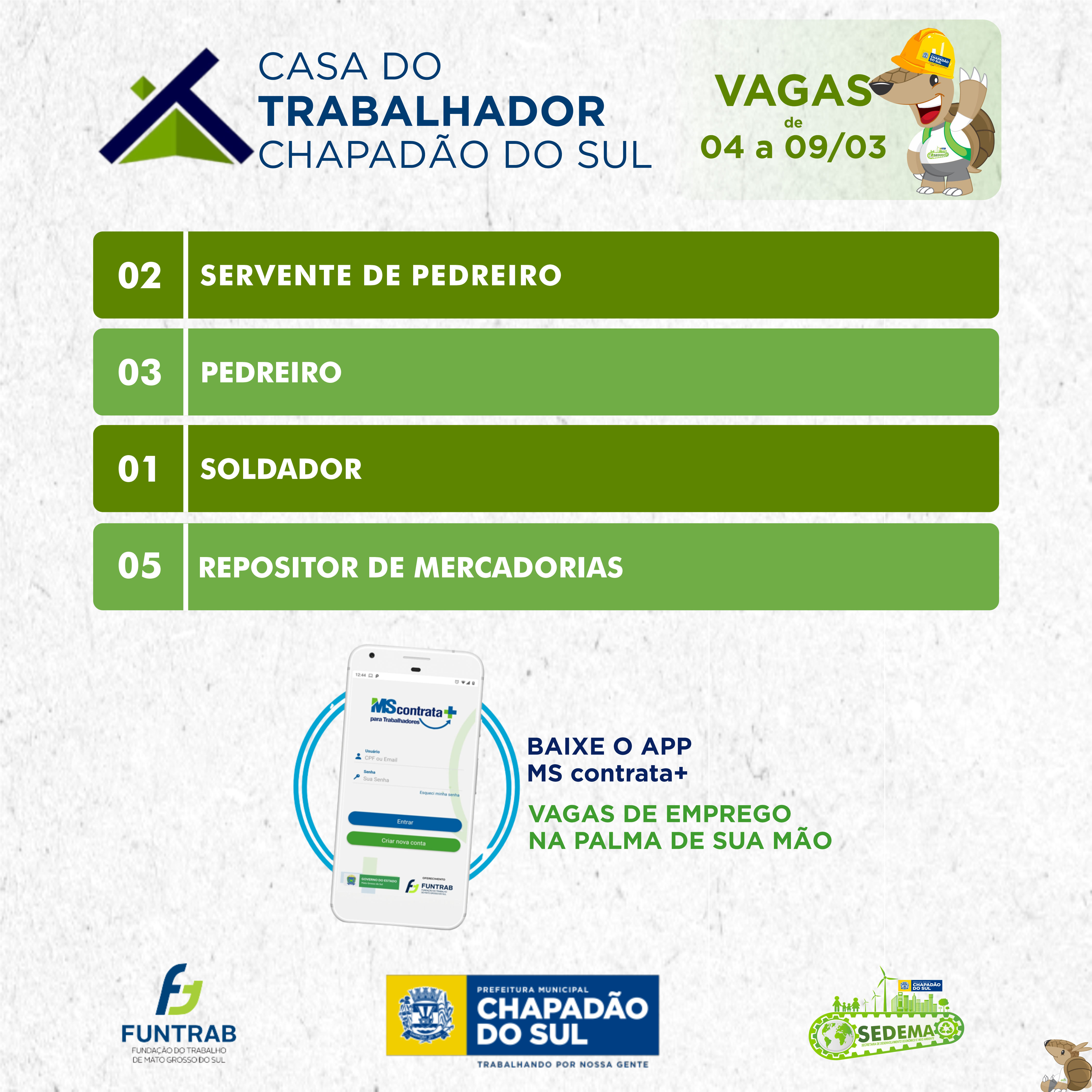 Para quem está precisando voltar ao mercado de trabalho ou busca um mudança de emprego, a Prefeitura de Chapadão do Sul e a SEDEMA, por meio da Casa do Trabalhador de Chapadão do Sul, disponibilizam vagas de emprego no município.
