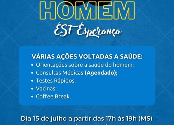 Ações acontecerão no ESF Esperança, entre às 17h e 19h e serão ofertadas vacinas, exames, testes rápidos, orientações sobre a saúde do homem e um Coffee Break.