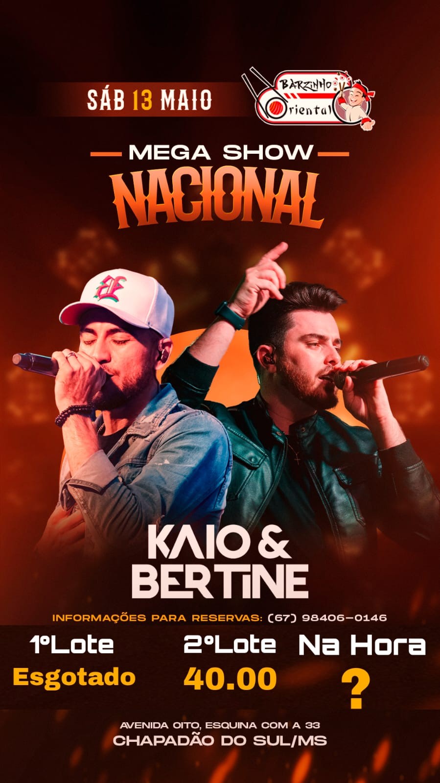 Acontece neste sábado (13), no Barzinho Oriental, mais um grande show de uma das duplas que vem se destacando, Kaio & Bertine.
