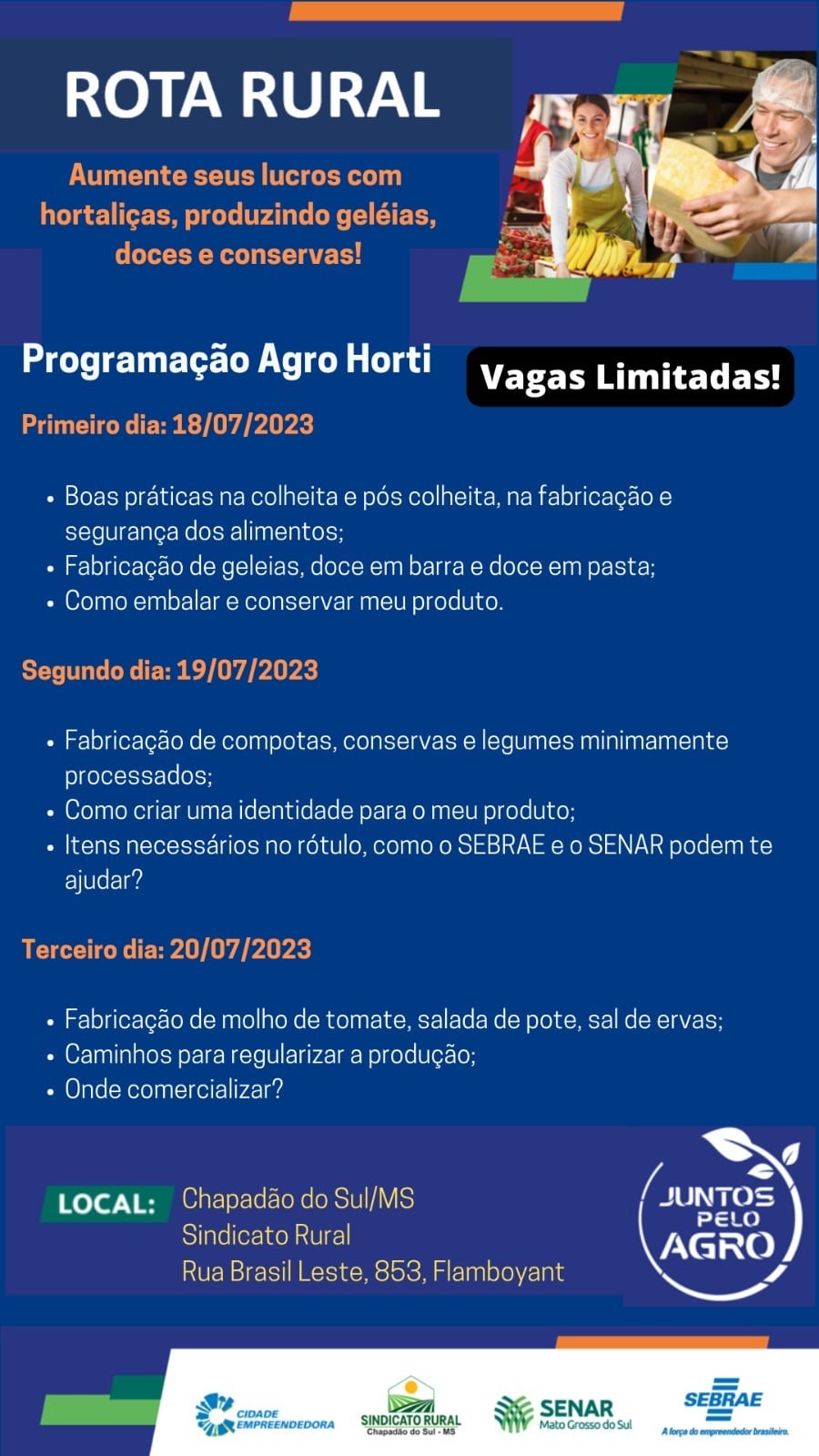 A Rota Rural é composta por 2 espaços de capacitação (Queijaria e Hortifruti) com disponibilidade de 15 vagas cada uma. A programação é de 6h diárias (09h às 12h e das 13h às 16h), com almoço no local, durante 3 dias consecutivos, portanto o produtor que se inscrever deve estar ciente de que será uma capacitação de 3 dias e só recebe o certificado quem participar de toda a capacitação.”