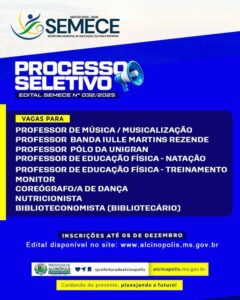 Alcinópolis abre processo seletivo para professores, coreógrafos e nutricionistas.