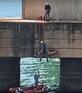 Pescador escorrega de pilar da ponte rodoferroviária do Rio Paraná na divisa entre MS e SP