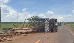 Carreta carregada de eucalipto sofre acidente na BR 060, em Paraíso das Águas: