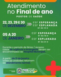 Secretaria de Saúde divulga funcionamento das unidades durante o fim de ano e janeiro