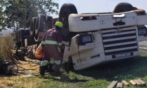 Caminhão carregado com milho tomba e motorista morre prensado na cabine em MS