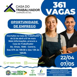 Casa do Trabalhador oferece 361 vagas para contratação imediata em Chapadão do Sul