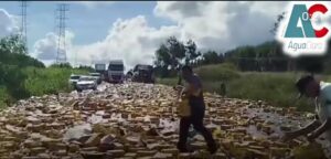 Carreta com carga de cerveja tomba na BR-262 em Água Clara e provoca confusão