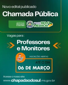 Prefeitura de Chapadão do Sul abre nova chamada pública para contratação de professores e monitores